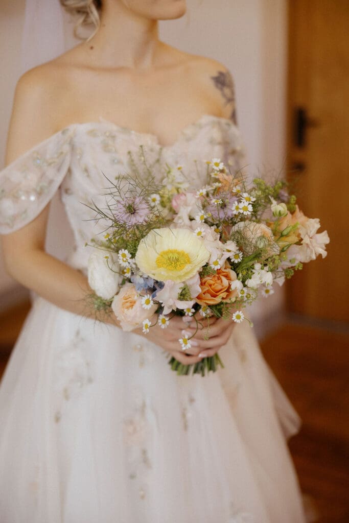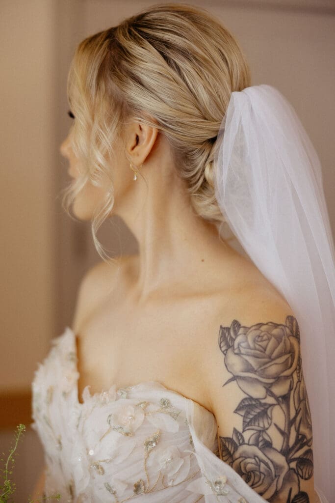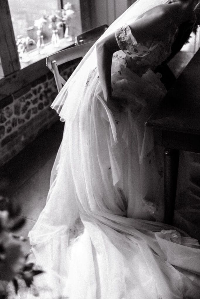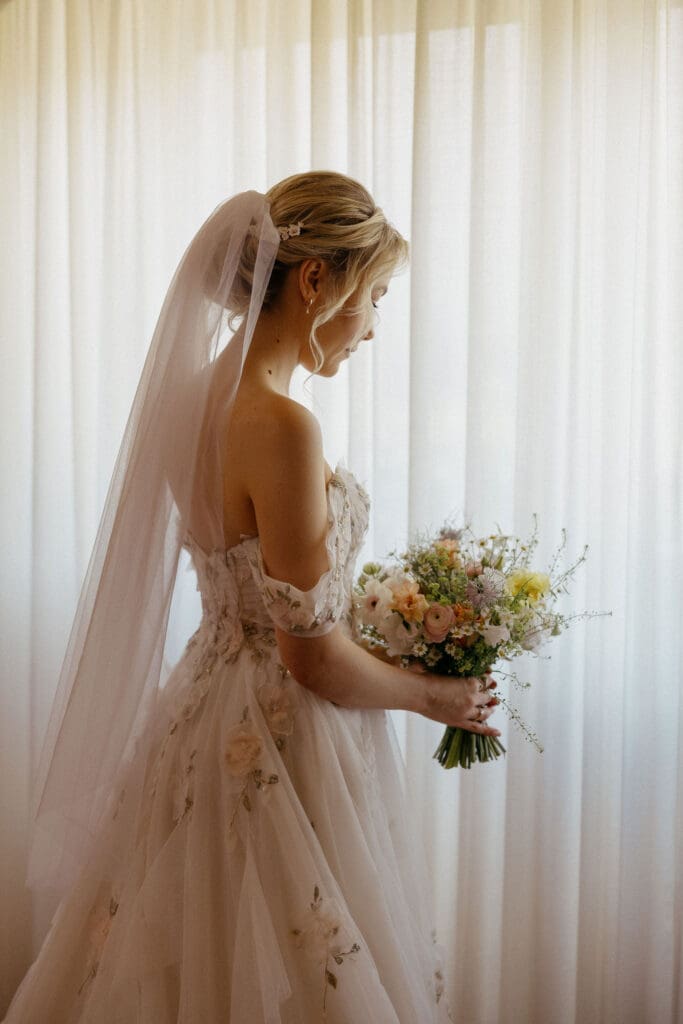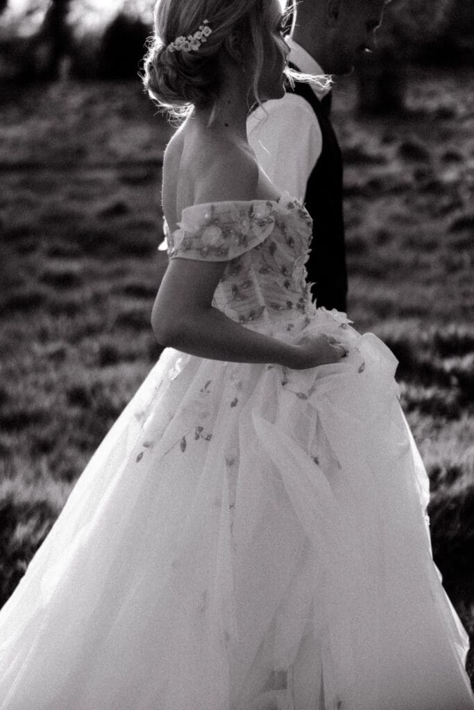 The bride’s gown was delicately detailed with soft florals woven into the fabric, adding texture and romance without overpowering the natural feel of the day.